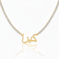 • 18k Gold plated stainless steel • Cubic zirconia tennis chain • Arabic name pendant • Available in 16", 18", 20" lengths • Includes 5cm extender for adjustability • Hypoallergenic